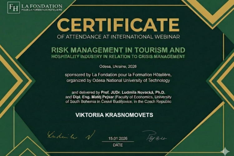 Доцентка кафедри туризму і готельно-ресторанної справи Вікторія Красномовець 15 січня 2026 року взяла участь у міжнародному вебінарі «Risk Management in Tourism and Hospitality Industry in Relation to Crisis Management».