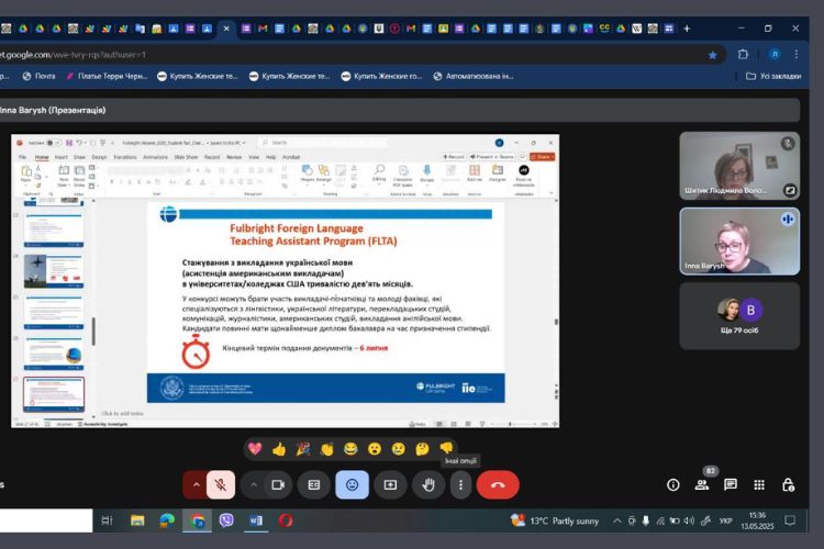 Інна Бараш акцентувала на можливості цьогоріч долучитися до стажування з викладання української мови (асистенції американським викладачам) в університетах і коледжах США тривалістю дев’ять місяців (кінцевий термін подання документів — 6 липня). Доповідачка наголосила, що в конкурсі можуть брати участь викладачі-початківці та молоді фахівці, які спеціалізуються на лінгвістиці, українській літературі, перекладацьких студіях, комунікації, журналістиці, американських студіях, викладанні англійської мови.