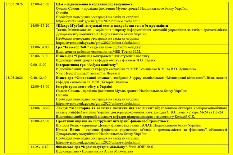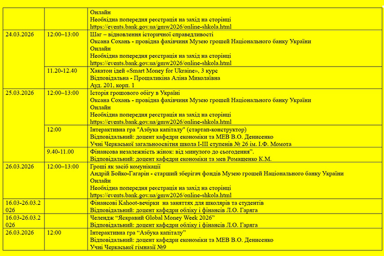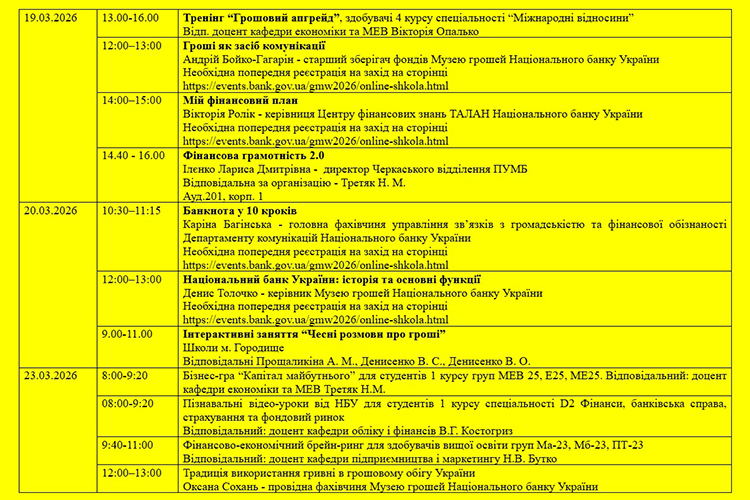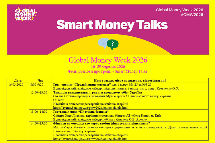 У межах Global Money Week 2026 навчально-науковий інститут економіки і права Черкаського національного університету імені Богдана Хмельницького організовує низку освітніх заходів для студентів та учнівської молоді, спрямованих на розвиток фінансової грамотності, формування фінансової культури та навичок відповідального управління особистими фінансами.
