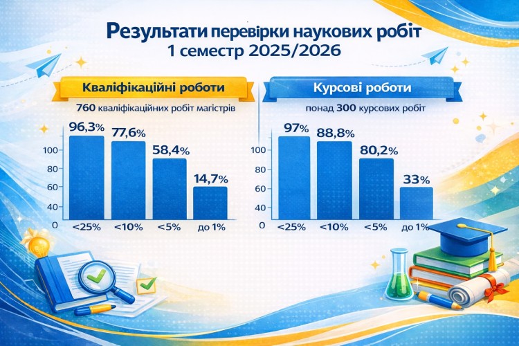 У Черкаському національному університеті імені Богдана Хмельницького підбито підсумки перевірки наукових робіт здобувачів вищої освіти на наявність текстових запозичень за результатами 1 семестру 2025/2026 навчального року. У межах цієї роботи відділом освітніх вимірювань проведено загальний аналіз результатів перевірки унікальності наукових текстів.
