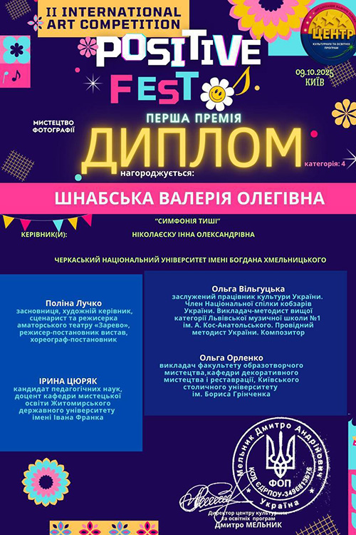 Валерія Шнабська, першокурсниця Черкаського національного університету імені Богдана Хмельницького, спеціальність А2 «Дошкільна освіта», здобула перемогу на Міжнародному мистецькому конкурсі «Positive Fest» у номінації «Мистецтво фотографії» з фотороботою «Симфонія тиші».