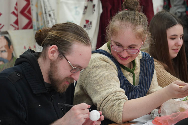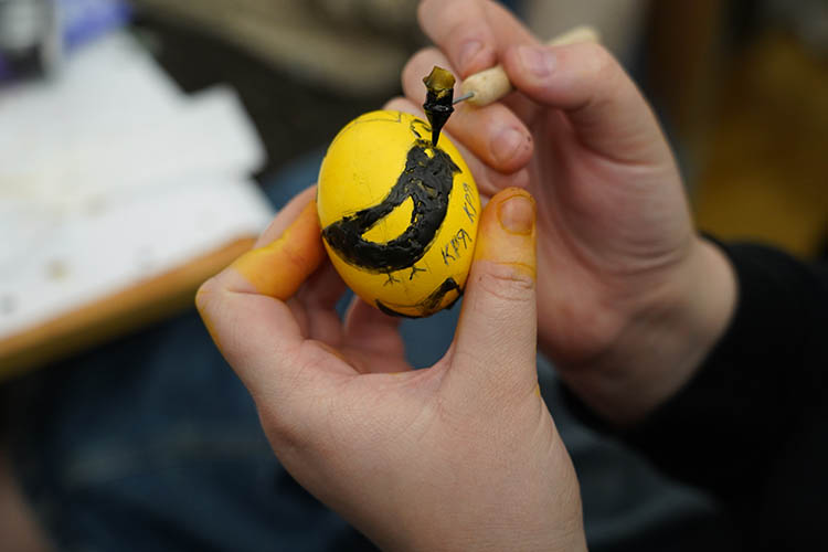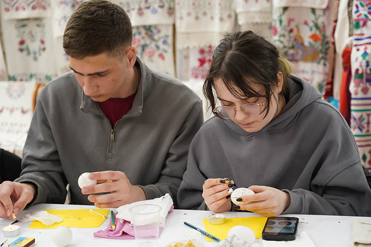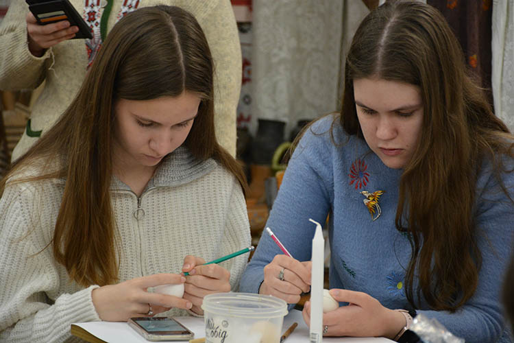 Майстриня із Черкаського обласного ресурсного центру Юлія Бухал разом з директоркою «Музею українського рушника» Наталією Ярмоленко навчали розмальовувати писанки студентів та викладачів ННІ української філології та соціальних комунікацій й ННІ іноземних мов.