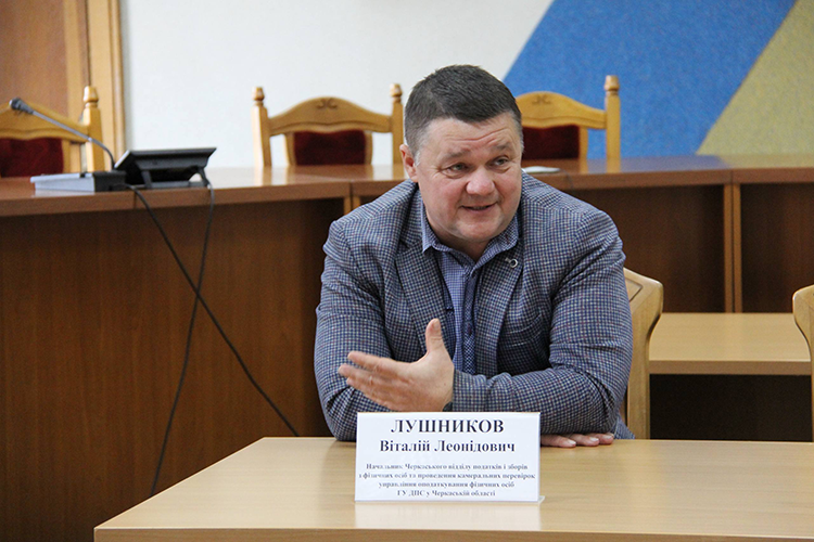 Начальник Черкаського відділу податків і зборів з фізичних осіб та проведення камеральних перевірок Управління оподаткування фізичних осіб ГУ ДПС у Черкаській області Віталій Лушников ознайомив студентів із особливостями адміністрування податків з фізичних осіб, зокрема податку на доходи, військового збору та єдиного податку. Він відзначив, що сучасні електронні сервіси істотно спрощують для громадян процес подання декларацій та отримання послуг від податкової служби.