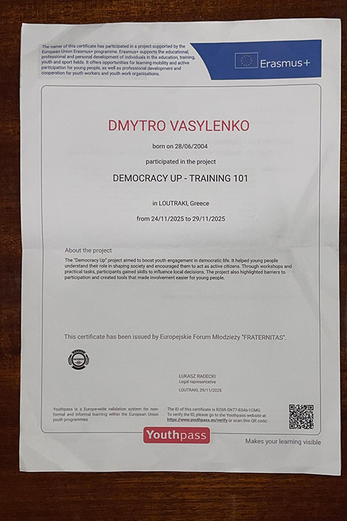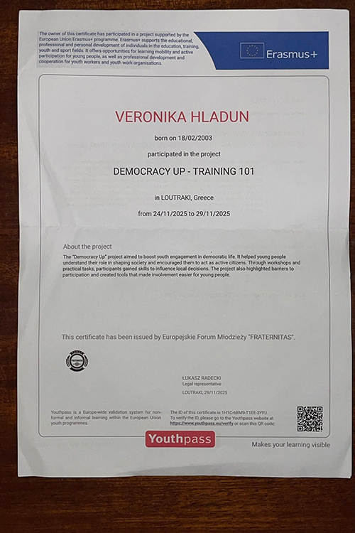 Студенти Черкаського національного університету імені Богдана Хмельницького Вероніка Гладун (спеціальність «Хореографія»), та Дмитро Василенко (спеціальності «Менеджмент соціокультурної діяльності») взяли участь у міжнародному проєкті Democracy Up – Training 101, що реалізовувався в межах програми Erasmus+ у місті Лутракі, Греція.