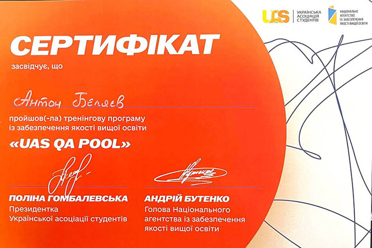 Студенти спеціальності 102 (Е3) «Хімія» Антон Бєляєв (3 курс) та Владислав Тарадайка (2 курс) Черкаського національного університету імені Богдана Хмельницького 3–5 квітня 2026 року взяли участь у тренінгу UAS QA Pool, організованому Українською асоціацією студентів спільно з Національним агентством із забезпечення якості вищої освіти (НАЗЯВО).