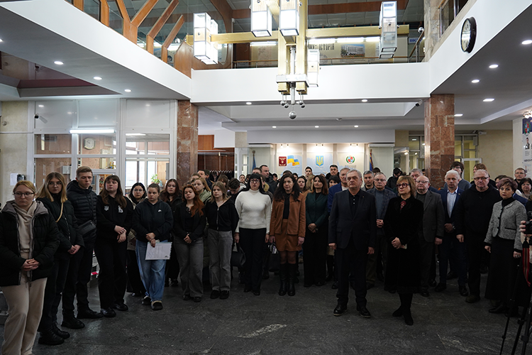 Епіцентром пам’ятних заходів в університеті став НК №1. Тут, біля інсталяції «Україна. Війна в Європі», зібралися члени ректорату та представники студентської ради, викладачі та працівники університету.