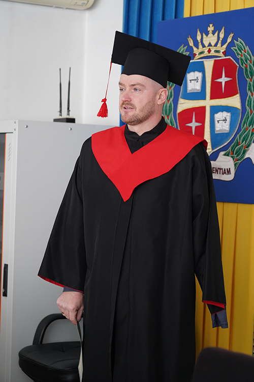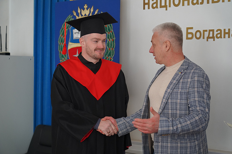 Випускнику ННІ економіки і права Черкаського національного університету імені Богдана Хмельницького, ветерану російсько-української війни, спортсмен і учасник міжнародних «Ігор Нескорених» Вадиму Мазніченку під час ректорату вручили диплом магістра.