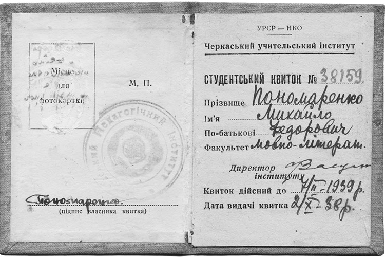 Михайло Пономаренко з’явився на світ Божий 28 жовтня 1920 року, а його рідними пенатами стало невеличке село Підставки на Золотоніщині. Зростав у високодуховній родині священнослужителя та педагога, й це багато в чому визначило його життєві пріоритети. Вже в школі у хлопця визрів твердий намір присвятити своє життя вчительській справі. Здобути цей фах після закінчення Горобіївської семирічки (у Підставках працювала лише початкова школа) Михайло вирішив у Золотоніському педтехнікумі. Він був гордістю закладу, надійною опорою педагогів. Тож і не стало ні для кого несподіванкою, коли саме йому випала честь відразу з отриманням диплома викладати в рідному технікумі. Та, на жаль, ці перші, доволі успішні педагогічні кроки Михайла виявилися нетривалими: всього кілька місяців. Його призвали на військову службу якраз у передгроззя 1940-го; не думав, не сподівався, що не зніматиме військову форму аж до 1945 року.