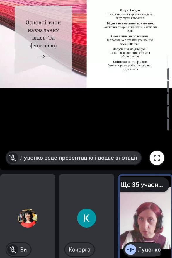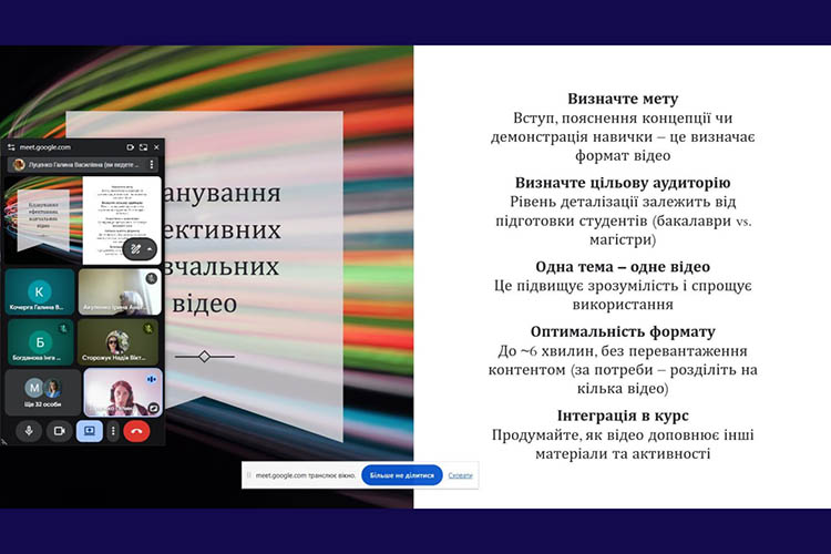 На початку тренінгу учасники ознайомилися з теоретичними засадами створення освітнього відеоконтенту, зокрема з принципами педагогічного дизайну відео, особливостями сприйняття інформації у відеоформаті та вимогами до структури й тривалості навчальних матеріалів.