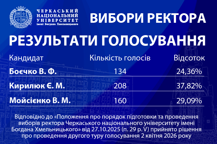 Євген Кирилюк та Василь Мойсієнко вийшли у другий тур виборів ректора ЧНУ 26 березня Черкаський національний університет імені Богдана Хмельницького обирав ректора. Наступна
