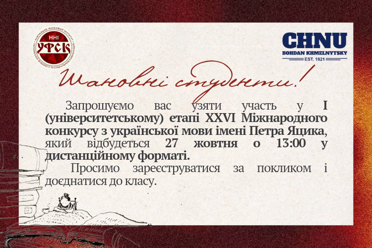 Студентів Черкаського національного університету імені Богдана Хмельницького запрошують узяти участь у І (університетському) етапі ХХVІ Міжнародного конкурсу з української мови імені Петра Яцика, який відбудеться 27 жовтня о 13:00 у дистанційному форматі.