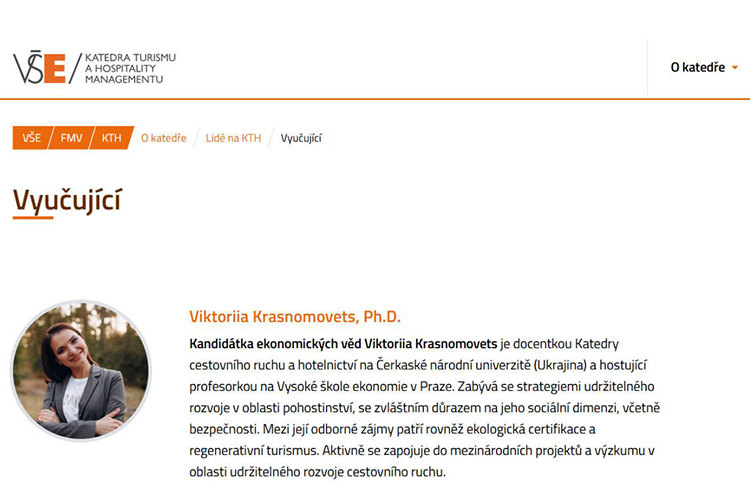 Черкаський національний університет імені Богдана Хмельницького вітає Вікторію Красномовець, кандидатку економічних наук, доцентку кафедри туризму і готельно-ресторанної справи, із важливим професійним досягненням — отриманням статусу запрошеної професорки (Guest Lecturer) на кафедрі туризму і готельно-ресторанного менеджменту факультету міжнародних відносин Вищої школи економіки в Празі (VŠE).