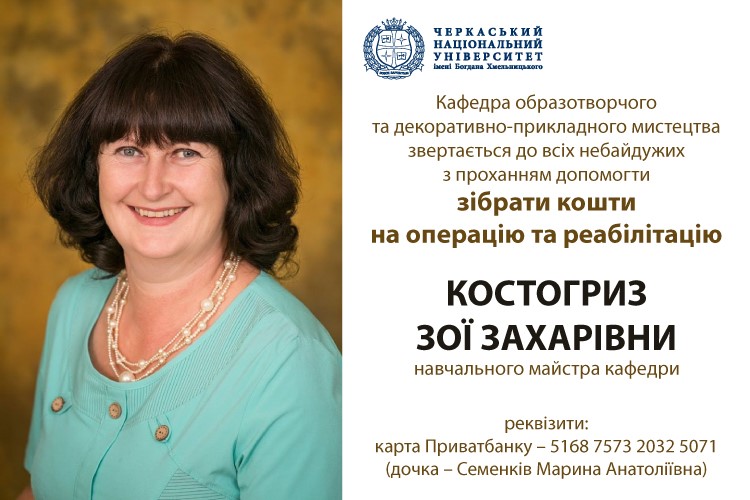 Усіх небайдужих до цієї доброї та щирої людини кафедра образотворчого та декоративно-прикладного мистецтва, університет, сім’я та близькі просять про фінансову допомогу.