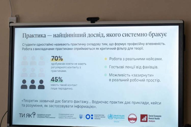 Водночас є позитивна динаміка: інтерес до спеціальності «Психологія» за п'ять років зріс удвічі — з 2,8% у 2020 році до 5,6% у 2024-му. 56% студентів позитивно оцінюють теоретичну підготовку, а понад чверть активно використовують інноваційні підходи.