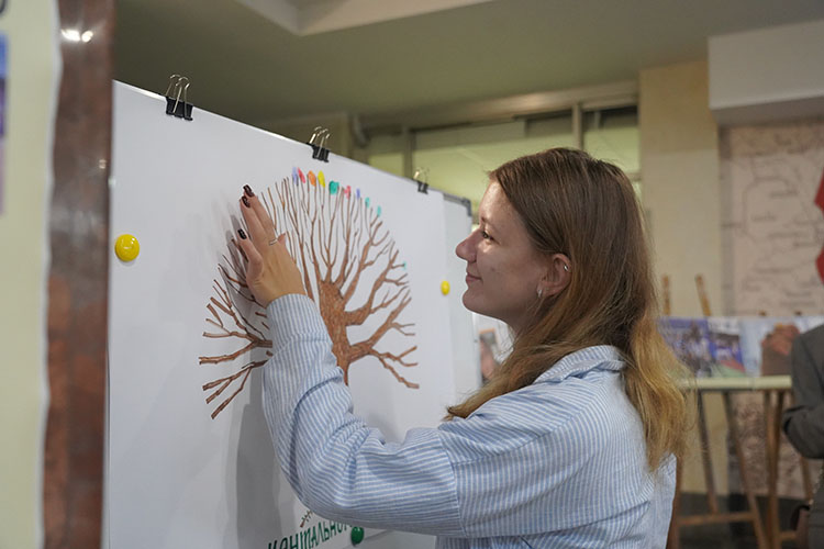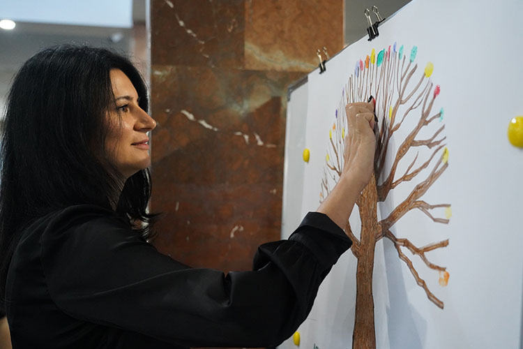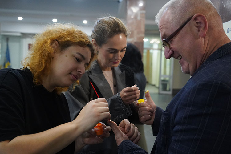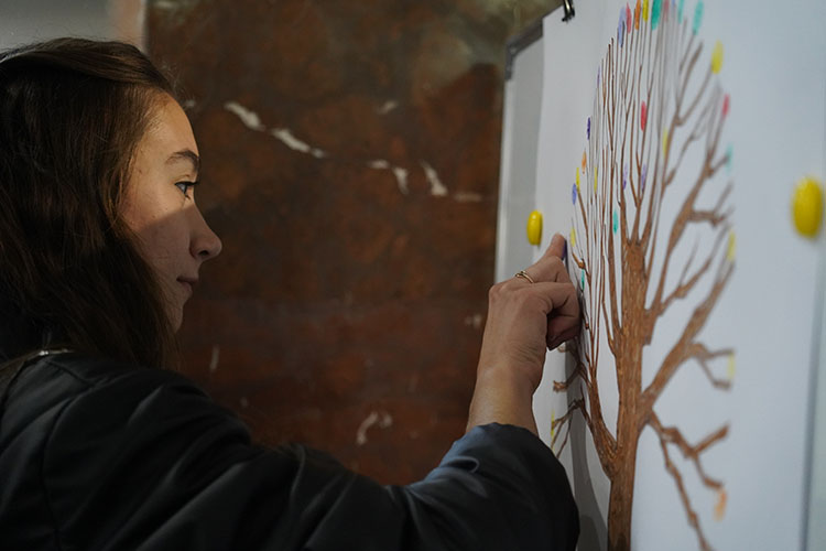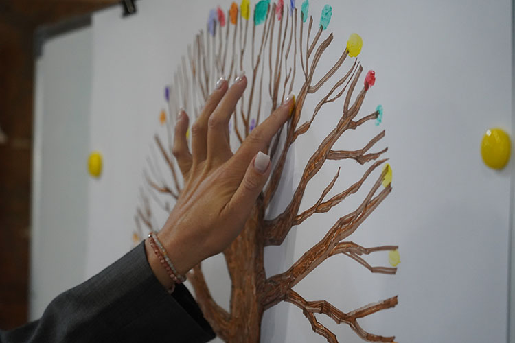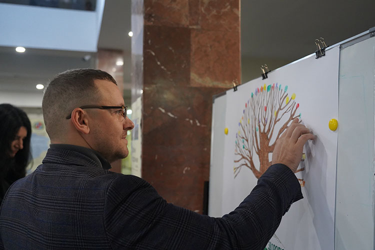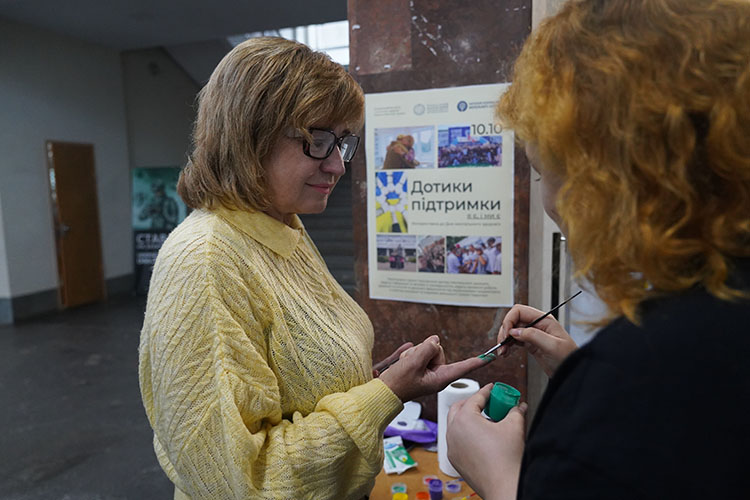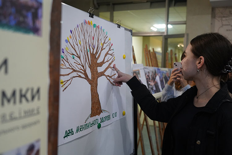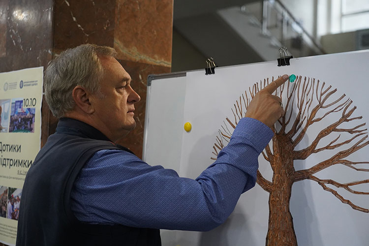 Особливий інтерес відвідувачів виставки викликало інтерактивне «Дерево дотиків підтримки». Замість традиційних листочків студенти та викладачі залишали на ньому кольорові відбитки своїх пальців за допомогою спеціальних фарб, створюючи візуальний символ єдності та спільної турботи.