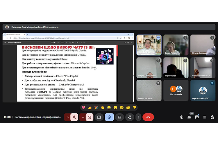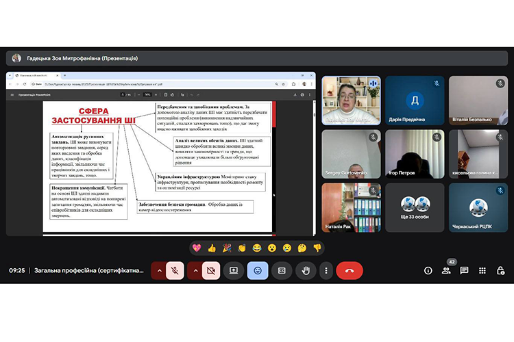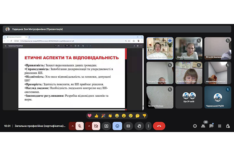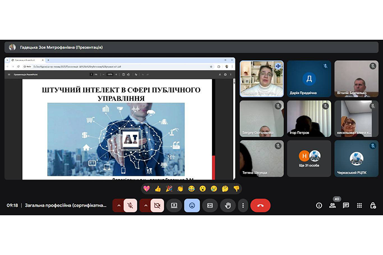 У межах професійного навчання 6 листопада 2025 року доцентка кафедри моделювання економіки і бізнесу Черкаського національного університету імені Богдана Хмельницького Зоя Гадецька презентувала у Черкаському регіональному центрі підвищення кваліфікації нову навчальну програму для державних службовців «Застосування штучного інтелекту у сфері публічного управління».