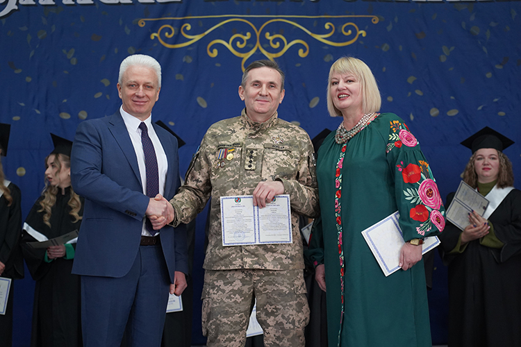 — Свого часу я також здобував магістерську освіту саме у цьому інституті, прагнучи вдосконалити свої управлінські якості. Ніколи не забуду високий рівень освітніх послуг, які тут надаються. Щиро дякую вам, дорогі магістри, за свідомий вибір на користь нашого університету, а вашим батькам — за підтримку. Наш заклад продовжує залишатися в когорті кращих університетів України, і сьогоднішня подія стала можливою лише завдяки Силам оборони України. Без тих, хто боронить нашу територіальну цілісність, ми б не змогли здійснювати свою освітню та наукову діяльність.