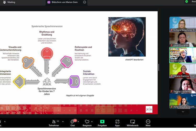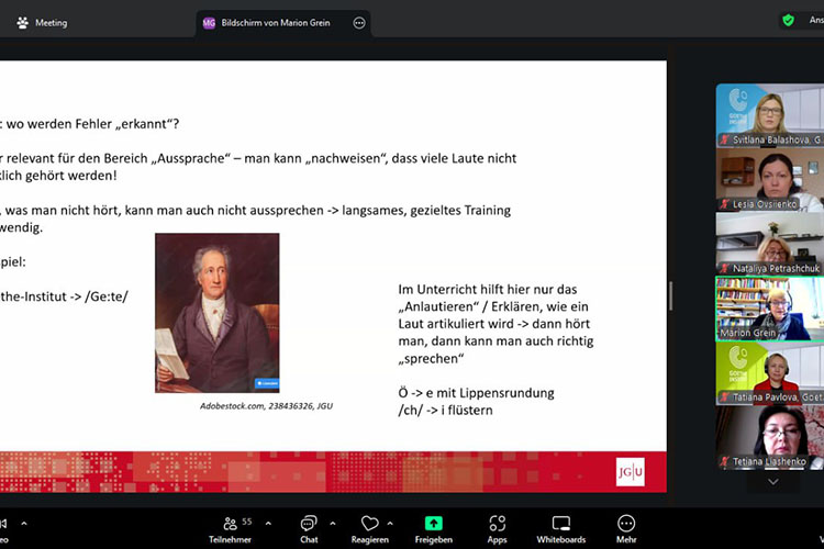 Викладачі кафедри німецької філології Черкаського національного університету імені Богдана Хмельницького Леся Овсієнко, Анастасія Ришкова та першокурсники другого магістерського рівня вищої освіти ОП «Мова і література (німецька, англійська)» відвідали лекцію професорки Maріон Грайн, керівниці магістерської програми «Німецька мова як іноземна мова / Німецька мова як друга мова» з університету Йоганна Гутенберга (Майнц, Німеччина)