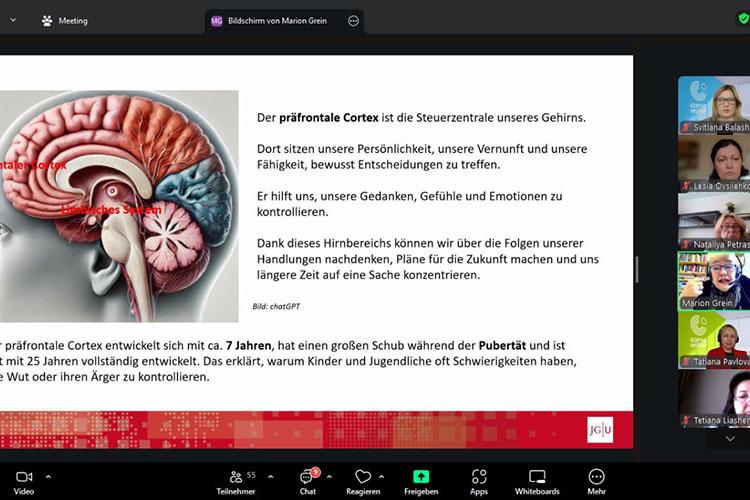 Здобувачі освіти дізналися багато нового про застосування нейродидактики у процесі вивчення німецької мови як іноземної. Професорка детально пояснила, як мозок людини здатний навчатися, як він працює під час вивчення мови, які фактори (емоції, мотивація, стрес, увага) впливають на запам’ятовування, яка роль викладача у навчанні мови, як можна застосувати найновіші результати досліджень, щоб зробити уроки німецької ефективнішими та цікавішими.