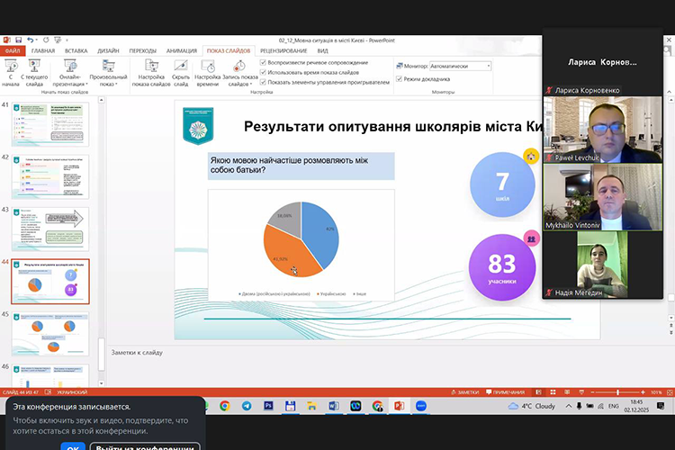 — мовну ситуацію в Києві, у навчальних закладах міста, особливо після повномасштабного вторгнення, що проявляється в повсякденному спілкуванні та сферах, які раніше функціювали переважно російською мовою. На основі соціолінгвістичного опитування лектор деталізував мовні практики та мовну поведінку дітей молодшого шкільного віку;