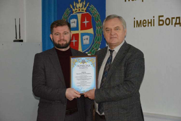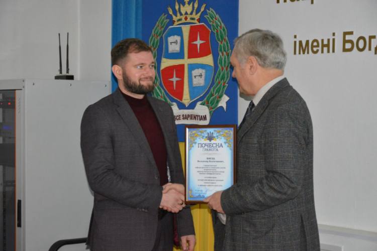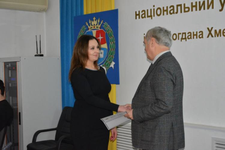 Члени вченої ради привітали колег із вагомими датами та видатними досягненнями. Олександр Черевко вручив диплом доктора філософії (PhD) Ользі Мальованій, випускниці університету, яка у травні успішно захистила дисертацію.