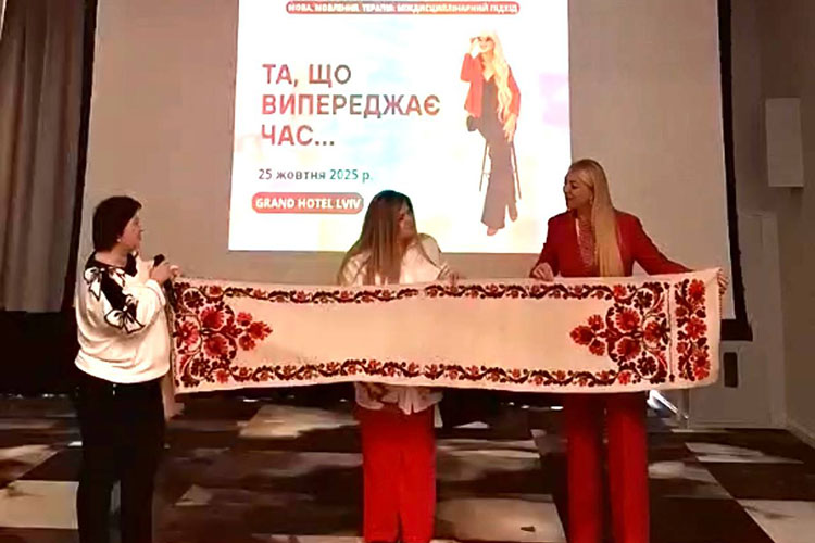 В теплій атмосфері конференції представниці університету привітали вельмишановну Зоряну Ленів із золотим ювілеєм та подарували оберіг із Черкащини — вишитий рушник як символ любові, вдячності й шани.