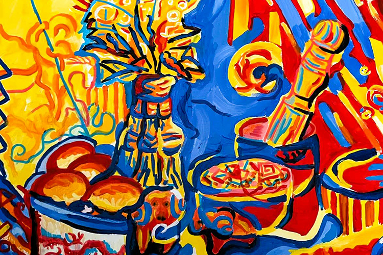 Картина виконана в експресивній декоративній манері. Насичені жовті, сині та червоні барви створюють відчуття тепла, руху та святкової енергії, а узагальнені форми й ритміка кольорових площин формують виразну авторську художню мову.