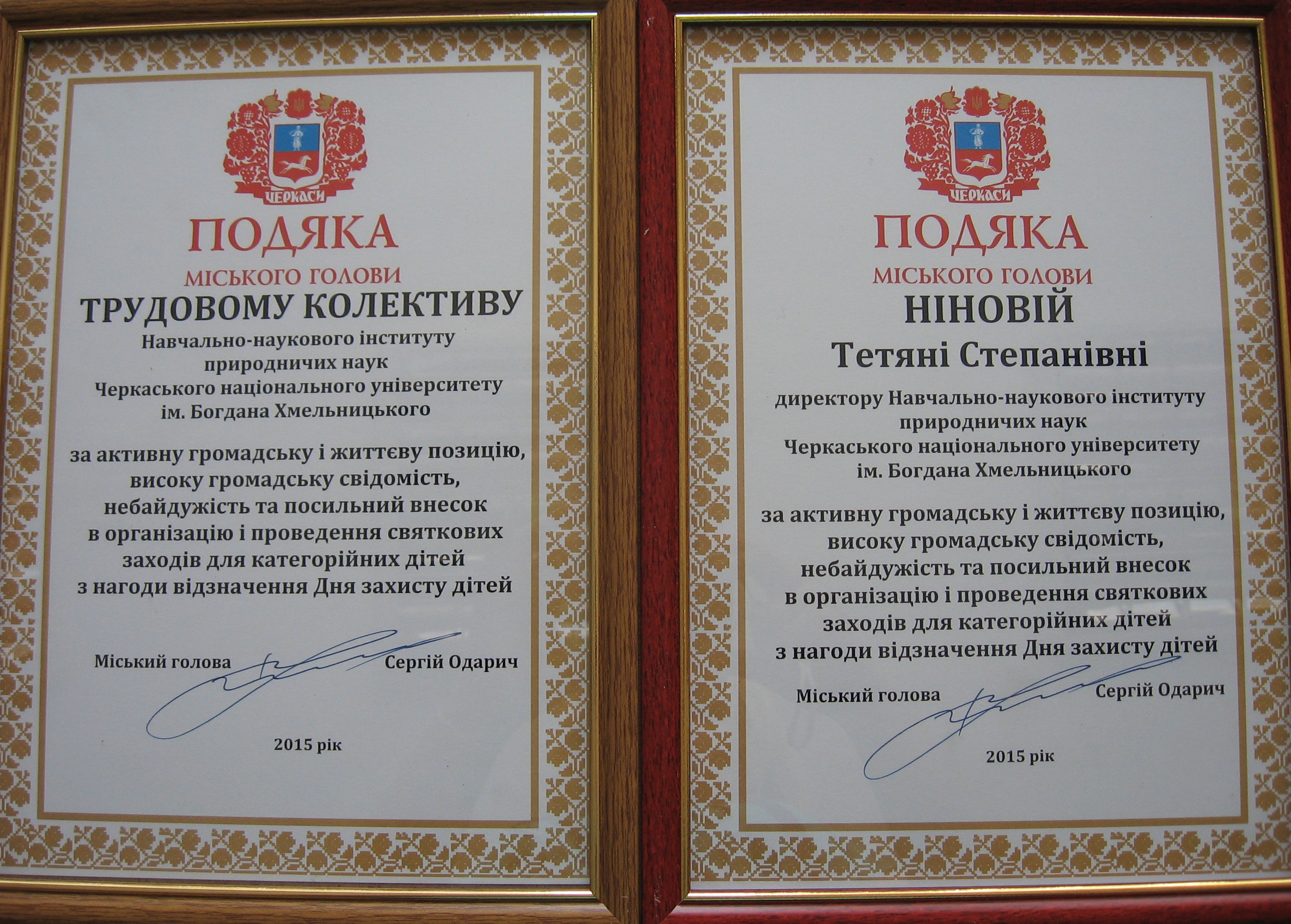Грамоту за проведення пізнавальних заходів для категорійних дітей отримали від міського голови Черкас Сергія Одарича працівники ННІ природничних наук.
