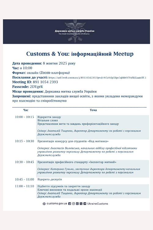 У межах реалізації Меморандуму про взаємодію та співробітництво між ЧНУ ім. Б. Хмельницького та Державною митною службою України відбулася онлайн зустріч «Customs & You» зі студентами та викладачами навчально-наукового інституту економіки і права.