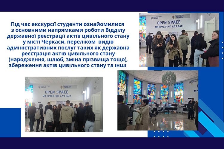 У межах інформаційної кампанії «Промодень на державній службі» для студентів Черкаського національного університету імені Богдана Хмельницького спеціальностей D4 «Публічне управління та адміністрування», D3 «Менеджмент», С2 «Політологія», D8 «Право» 16 квітня 2026 року провели екскурсію до Відділу державної реєстрації актів цивільного стану у місті Черкаси.