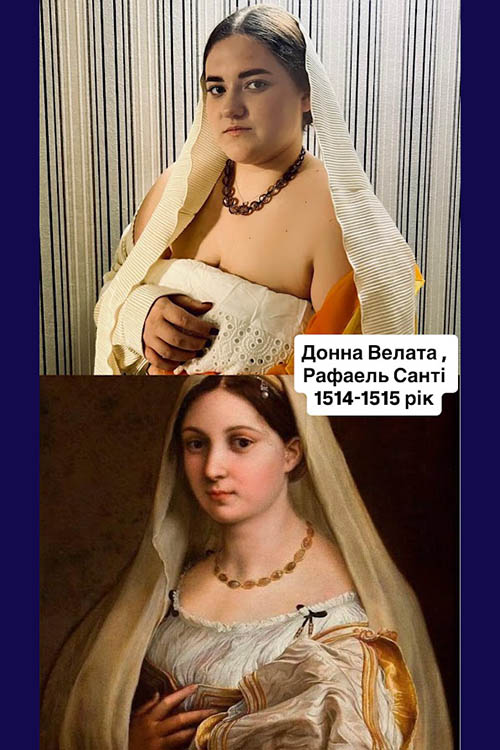 — Мені дуже сподобалася творче завдання з предмета «Історія культури Європи», адже ми відтворювали картини Середньовіччя, Відродження та інших історичних епох. Особливо цікавим для мене був сам процес — від формування ідеї до її втілення в життя. Це включало пошук відповідної атрибутики, підбір місця та створення атмосфери, усе це було дуже захопливо, весело й творчо. Особисто я брала участь у відтворенні картин «Пані з горностаєм» Леонардо да Вінчі та «Донна Велата» Рафаель Санті, які належать до епохи Відродження. Робота над цими образами дала мені змогу не лише краще зрозуміти мистецтво того часу, а й ніби на мить поринути в атмосферу тієї епохи, відчути її стиль, настрій і красу. А коли оцінюєш кінцевий результат своєї роботи, відчуваєш особливі, незрівнянні емоції та гордість за своєрідний власний витвір, — поділилася своїми враженнями Сабріна Власенко.