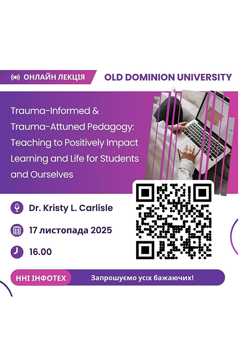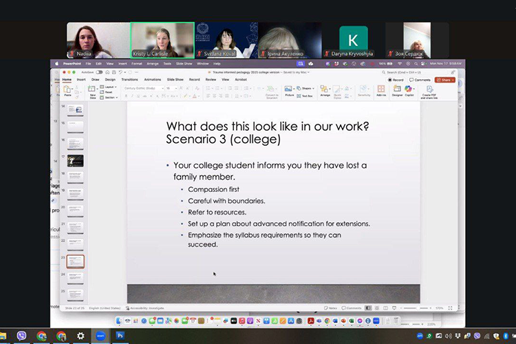 У межах інтернаціоналізації освітнього процесу в ННІ інформаційних та освітніх технологій Черкаського національного університету імені Богдана Хмельницького студенти та викладачі долучилися до лекції про травмоорієнтовану педагогіку докторки Крісті Карлайл, викладачки кафедри консультування та соціальних послуг Університету Олд Домініон, докторки філософії у галузі підготовки консультантів і супервізорів.
